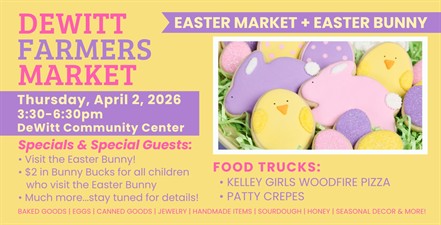 Join us for our Easter Market at the INDOOR Dewitt Winter Market on Thursday, April 2 from 3:30-6:30pm in the DeWitt Community Center! Over 30 vendors with produce, eggs, baked goods, handmade gift items, and more. The Easter Bunny will be available for photos! All children will get $2 in Bunny Bucks to spend with any vendor.